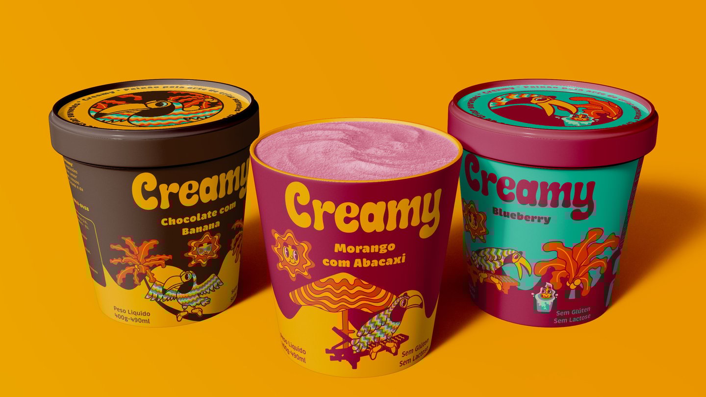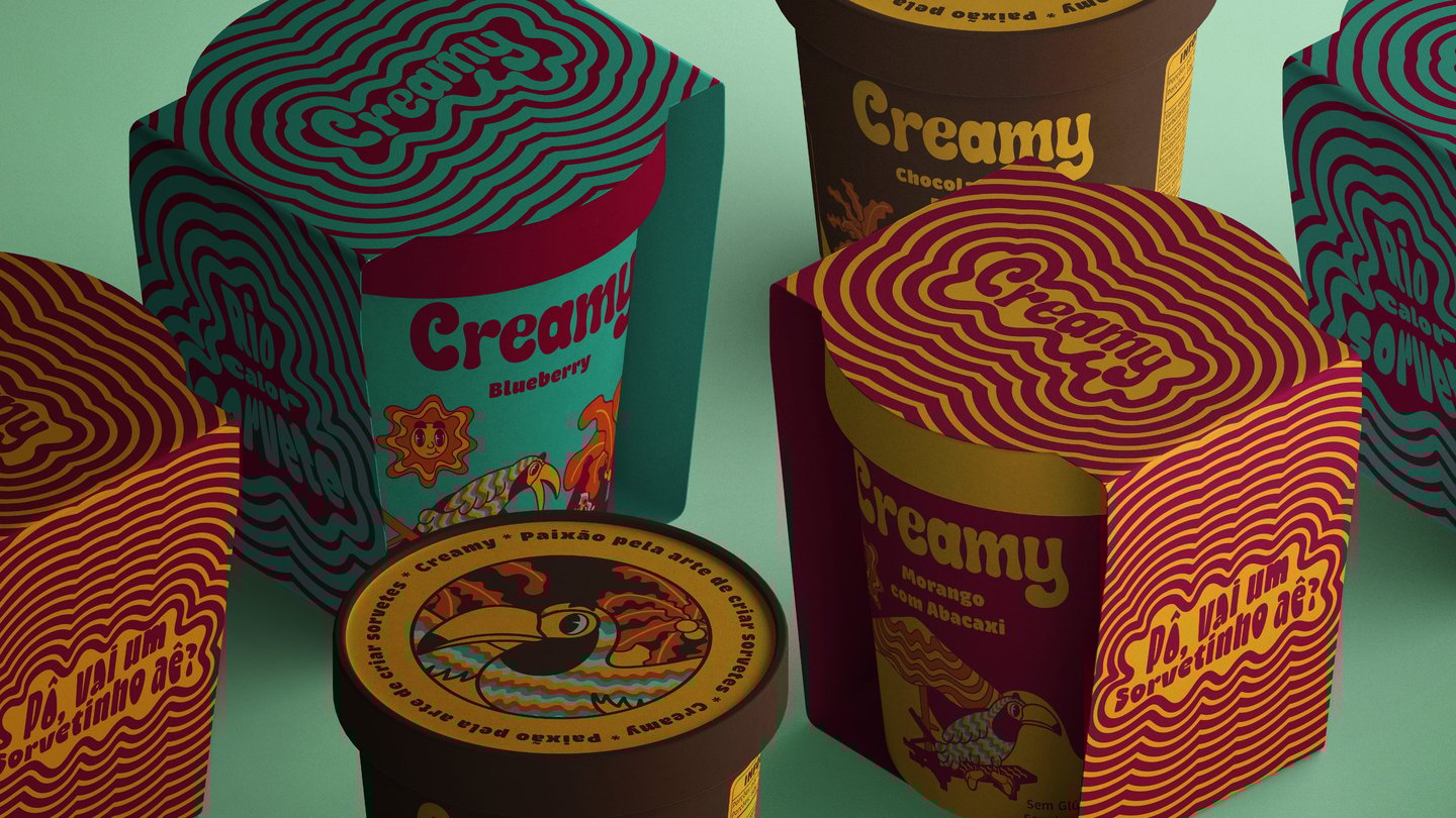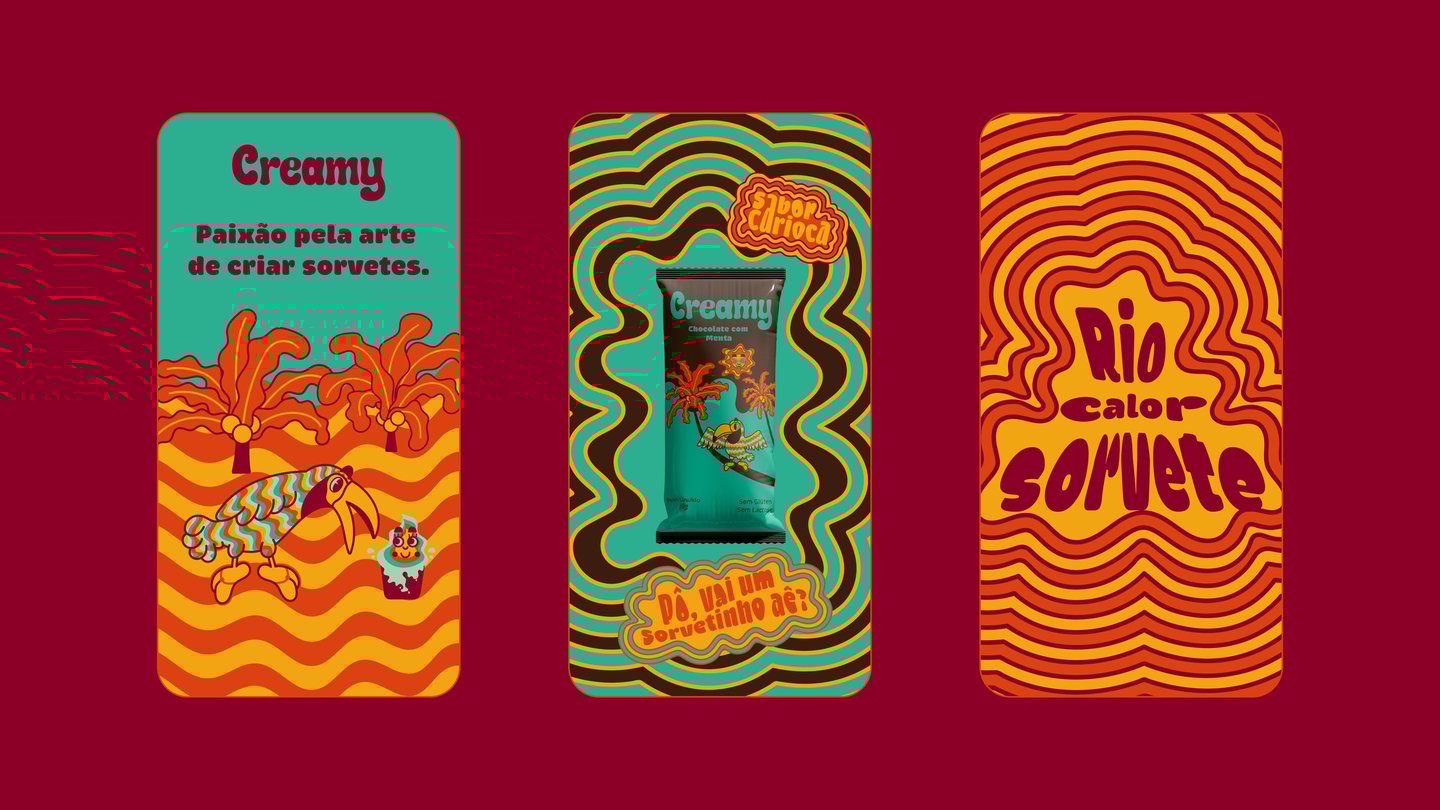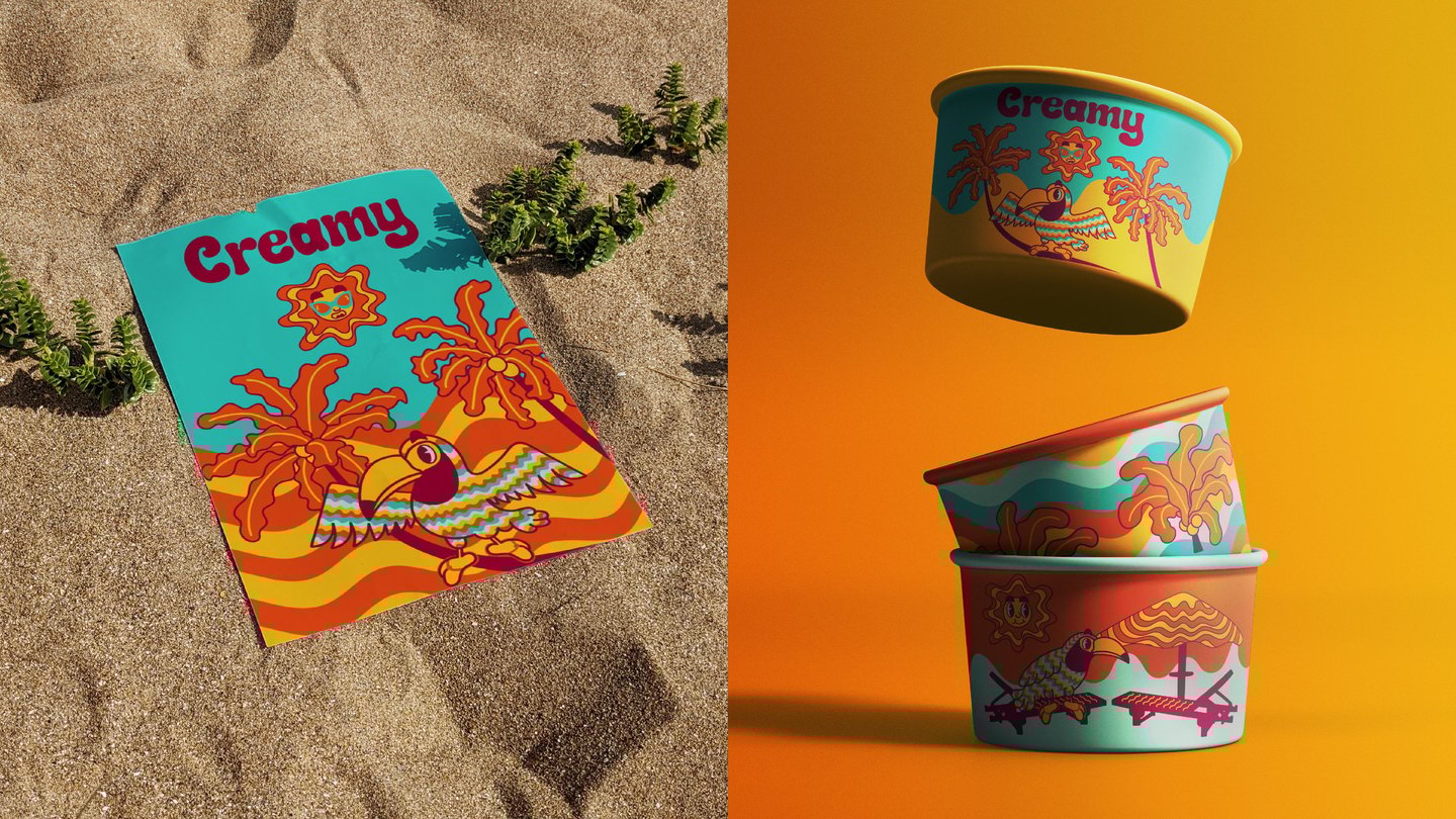 Inspired by summer in Rio, Creamy's visual identity uses vibrant colors and fluid shapes to reflect the joy and freshness of the brand.